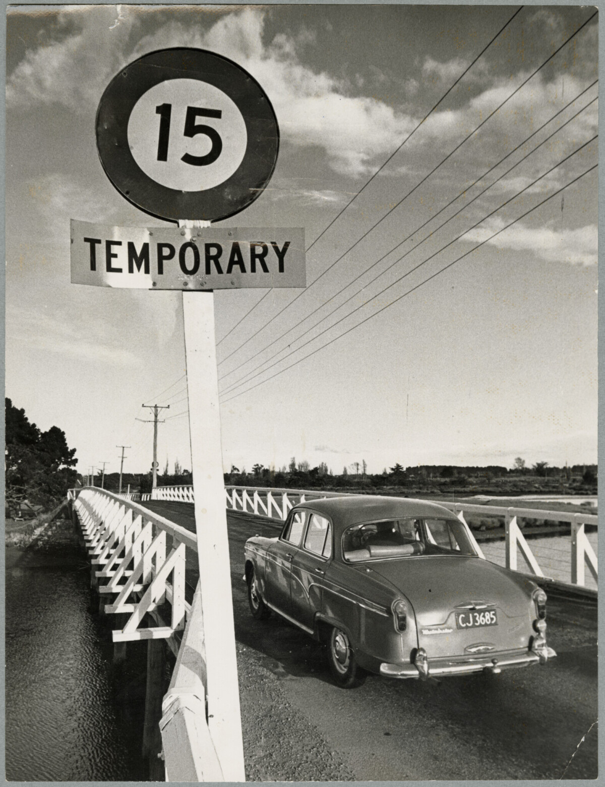 The South Brighton bridge which crosses the estuary near the Pleasant Point Yacht Club on Bridge Street, with a temporary speed limit sign.
