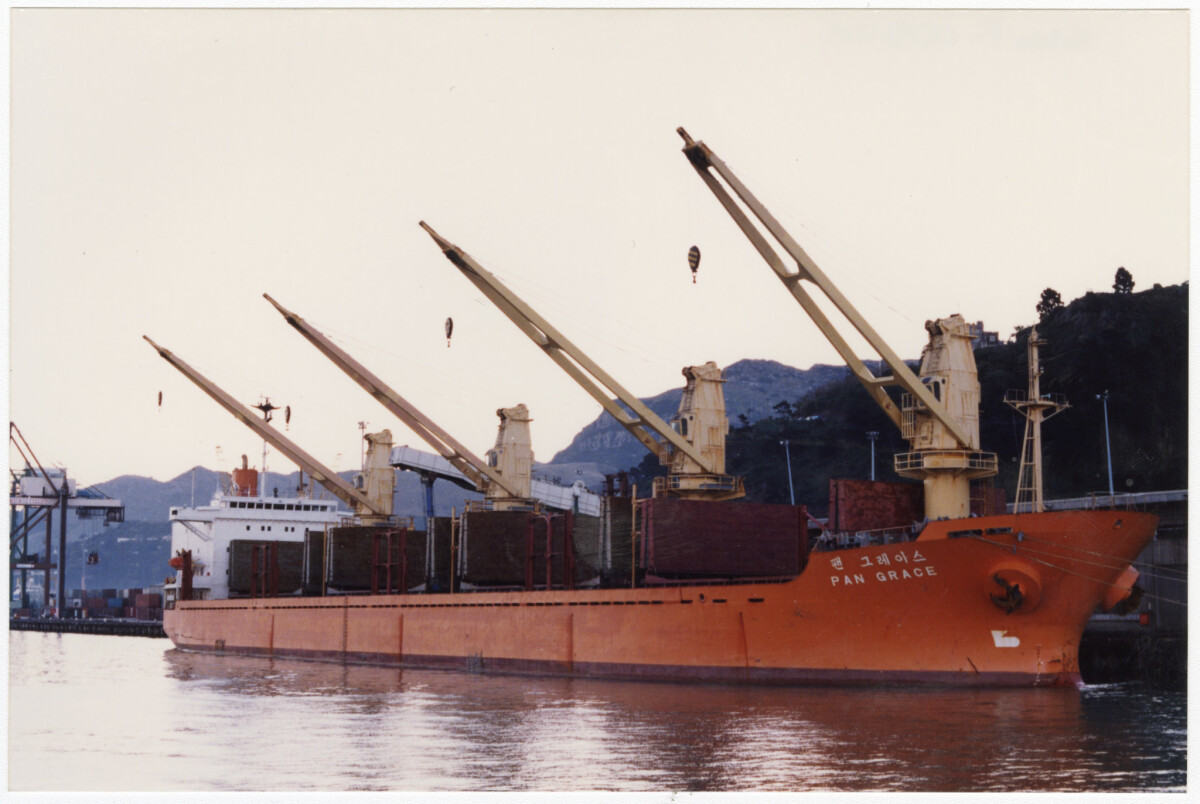 Large container ship with four hoists, Pan Grace, docked at Lyttelton Harbour. Views of the Port Hills are in the background.