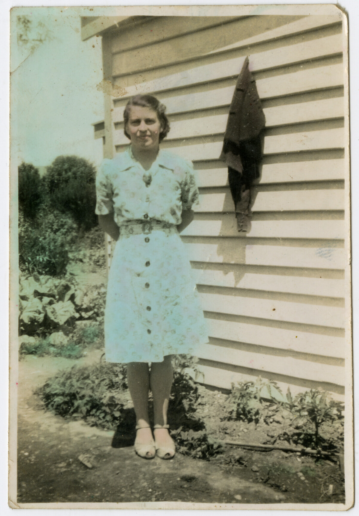 Betty standing outside her house at Hornbrook Street, Temuka.