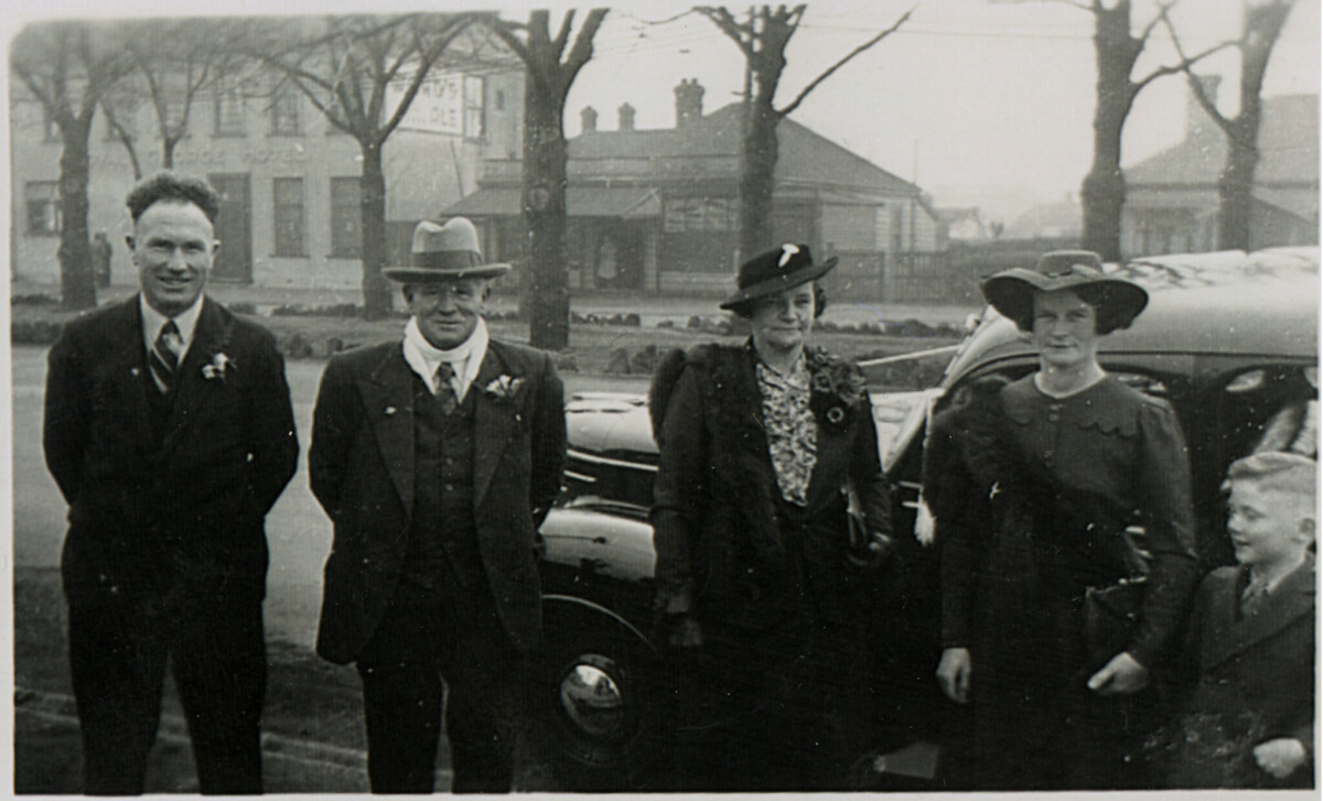 Four people by car (unknown, unknown Evelyn Sycomore, unknown, unknown). The Royal George Hotel, on Fitzgerald Avenue, is in the background.