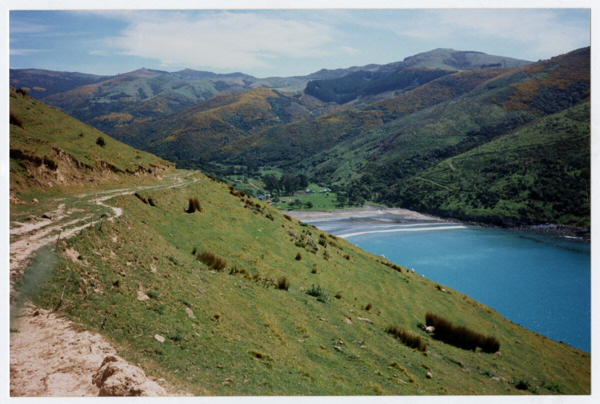 A fabulous view, one of the many walking the Banks Peninsula Track. Our track heading into Otanierito Bay for our last night's stay on this walk. Nov 6th 1994. Note the yellow gorse covering the Port Hills.