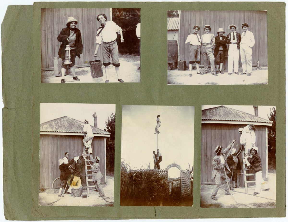 My grandmother and her friends having fun at their holiday house at Kairaki Beach. Five photos from a photograph album.