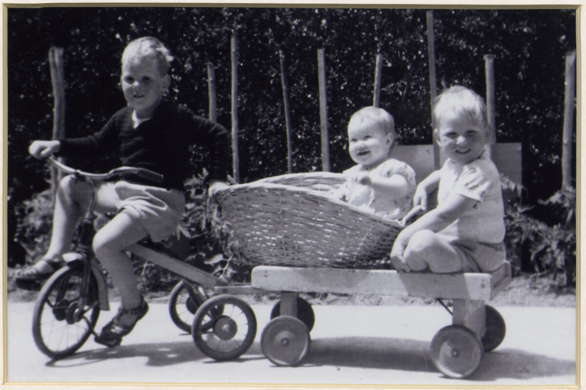Backyard fun, December 1962. Brothers Alan and Wayne take Lea for a ride in their trolley using the cane washing basket.