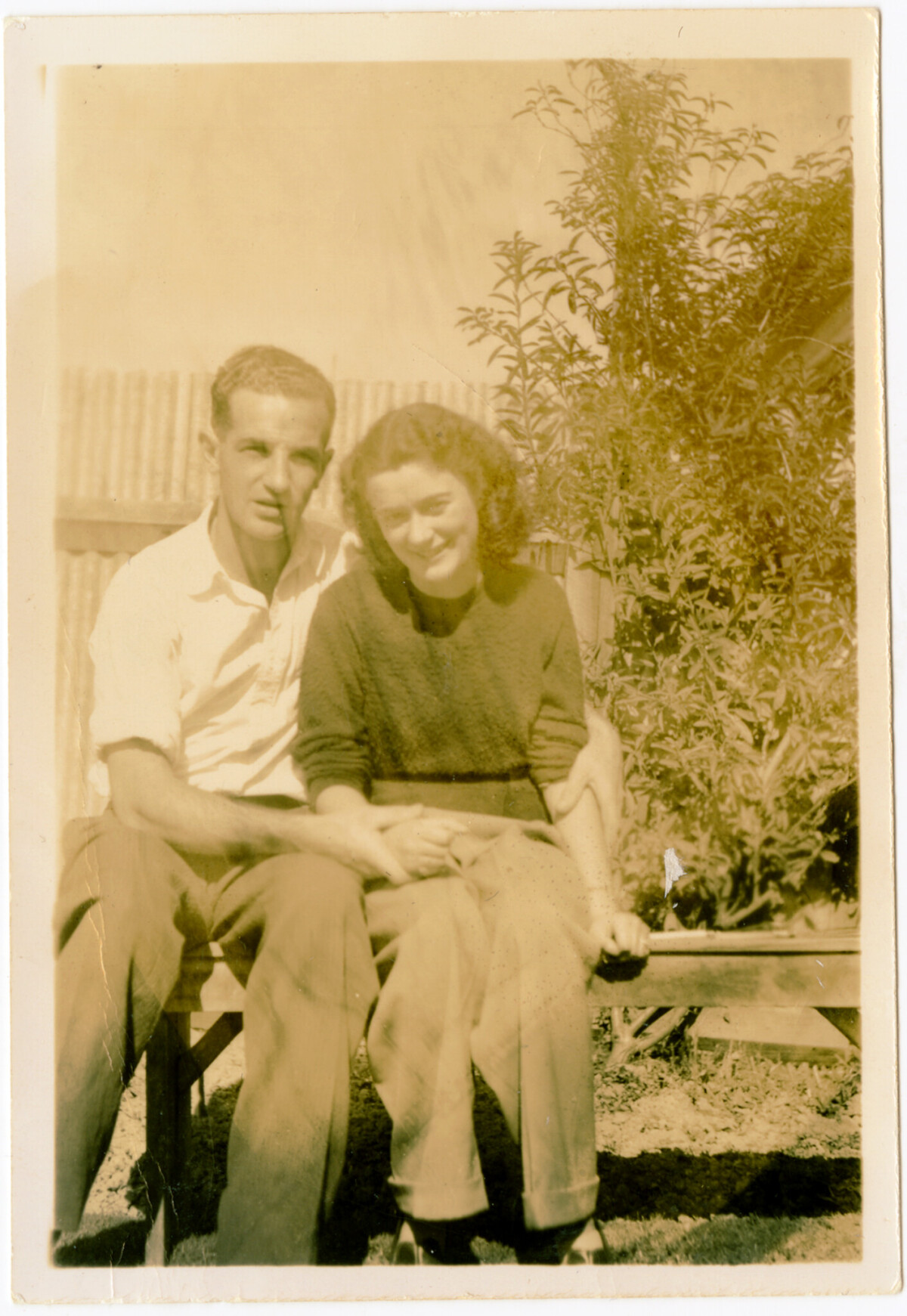 Dot and Jack Newlands in Redcliffs 1950. Dot knitted her own jumper and her trousers were tailor made in an expensive wool gaberdine with cuffs; considered quite trendy at the time.
