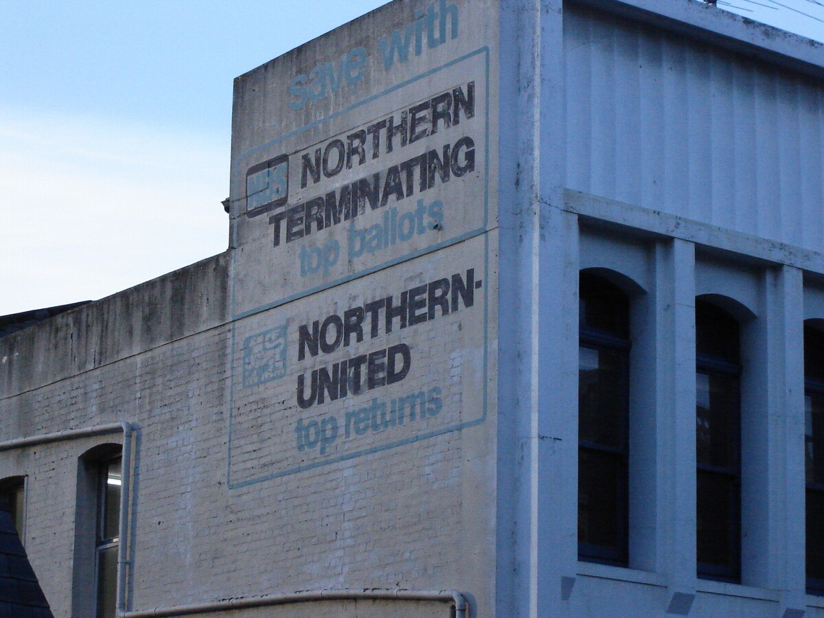 Ghost sign on the side of a building at 135 Gloucester St. Sign reads : Save with northern terminating top ballots Northern-United top returns.