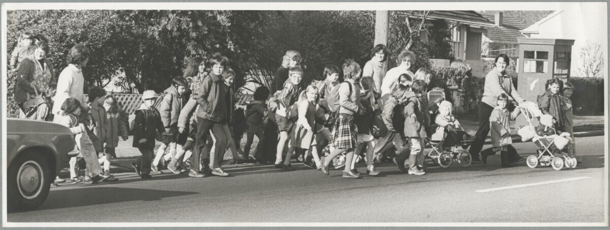 Children from St James Catholic School and Aranui Primary School crossing Pages Road near Marlow Street.
