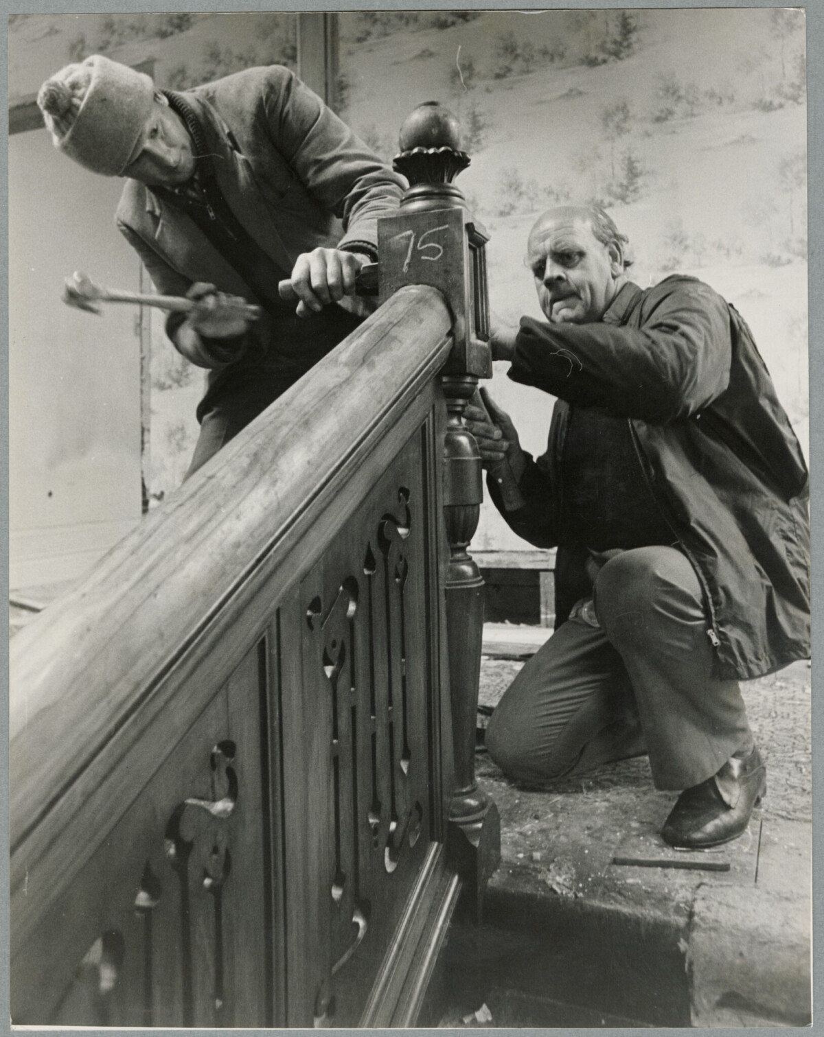 Workmen Gavin Gunn and Ray Hayward removing a staircase in Resthaven Home, 901 Colombo Street. The staircase is to be re-used in a private home.