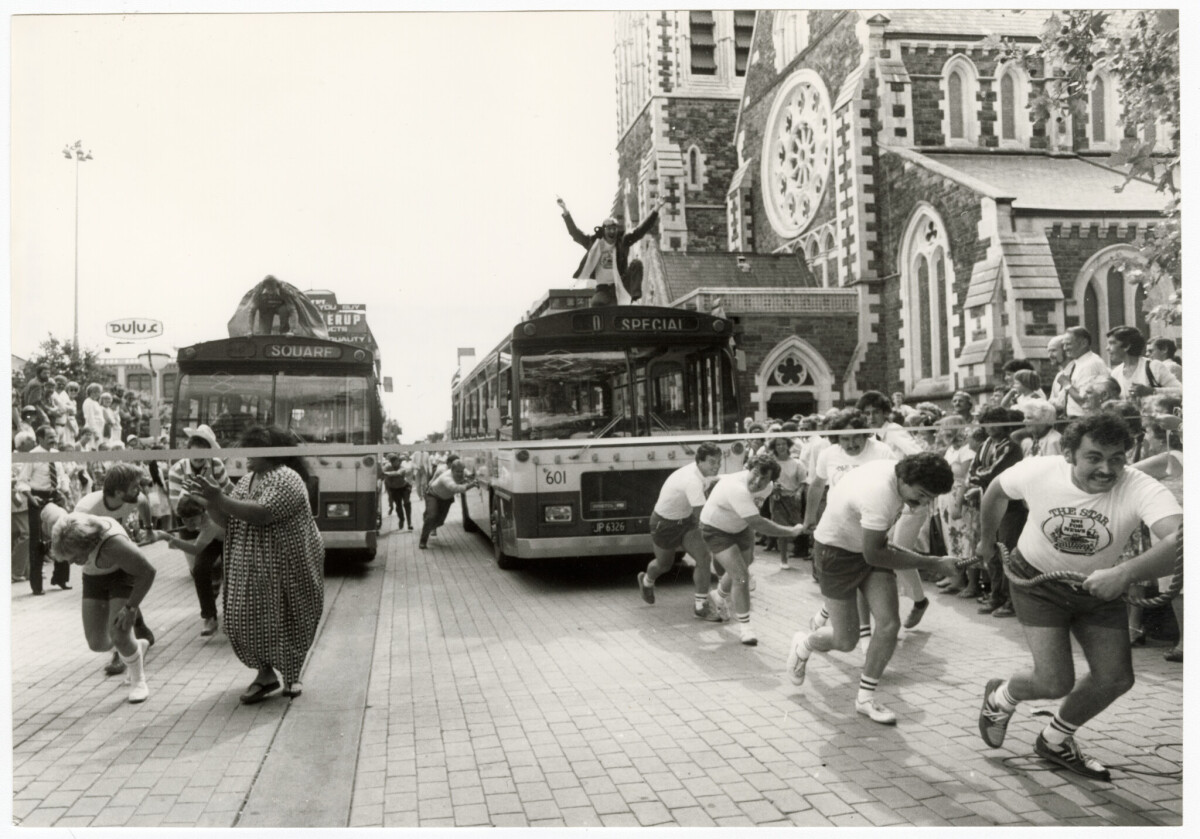 Members of the Star Newspaper team pulling a bus against the Radio 3ZB team in Cathedral Square for the Bus-N-Win bus race.