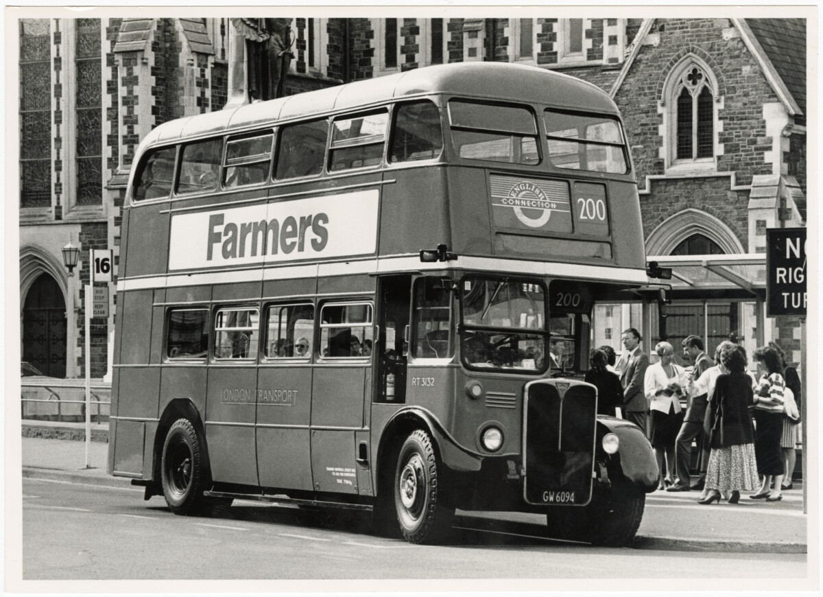 View of a London Transport double decker bus in Cathedral Square with an advertisement for Farmers on the side.
