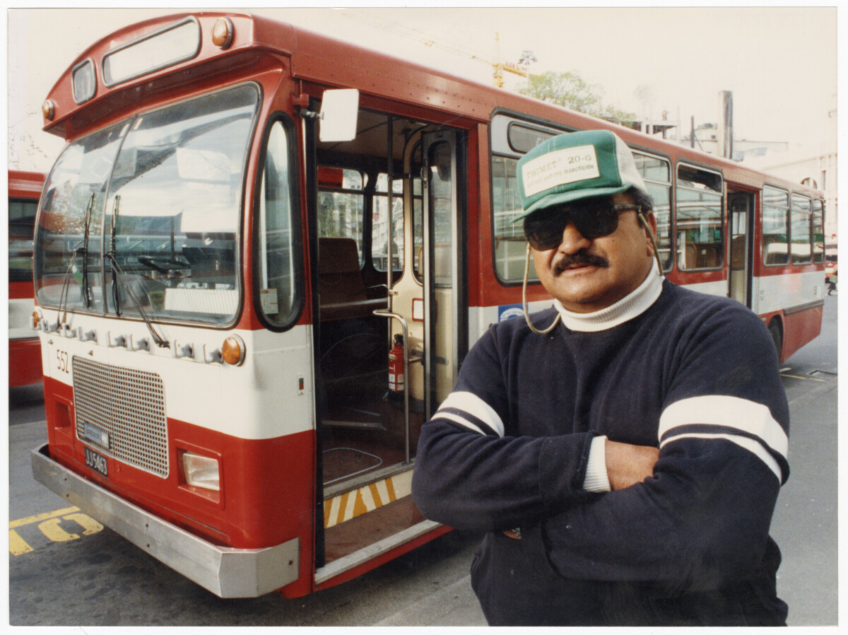 Bus driver, Peter Phillips, wearing mufti to protest deregulation of public transport at the Ferry Road bus depot at 120 Ferry Road.