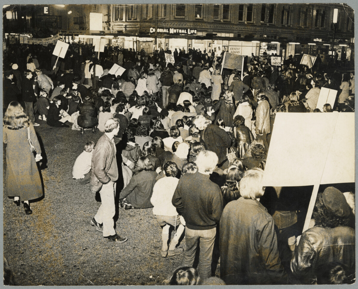 View of anti-Vietnam war Protesters gathered in Cathedral Square by the Colonial Mutual Life building.