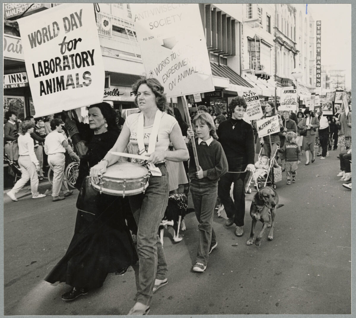 World Day for Laboratory Animals march on High Street towards Cathedral Square including members of the Anti-Vivisection Society.