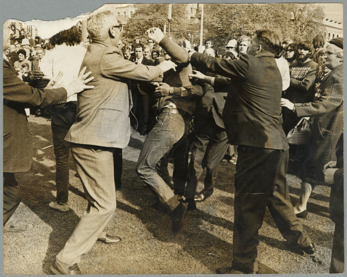 RSA members restraining a protester who disrupted the Anzac ceremony at the Citizens War Memorial in Cathedral Square.