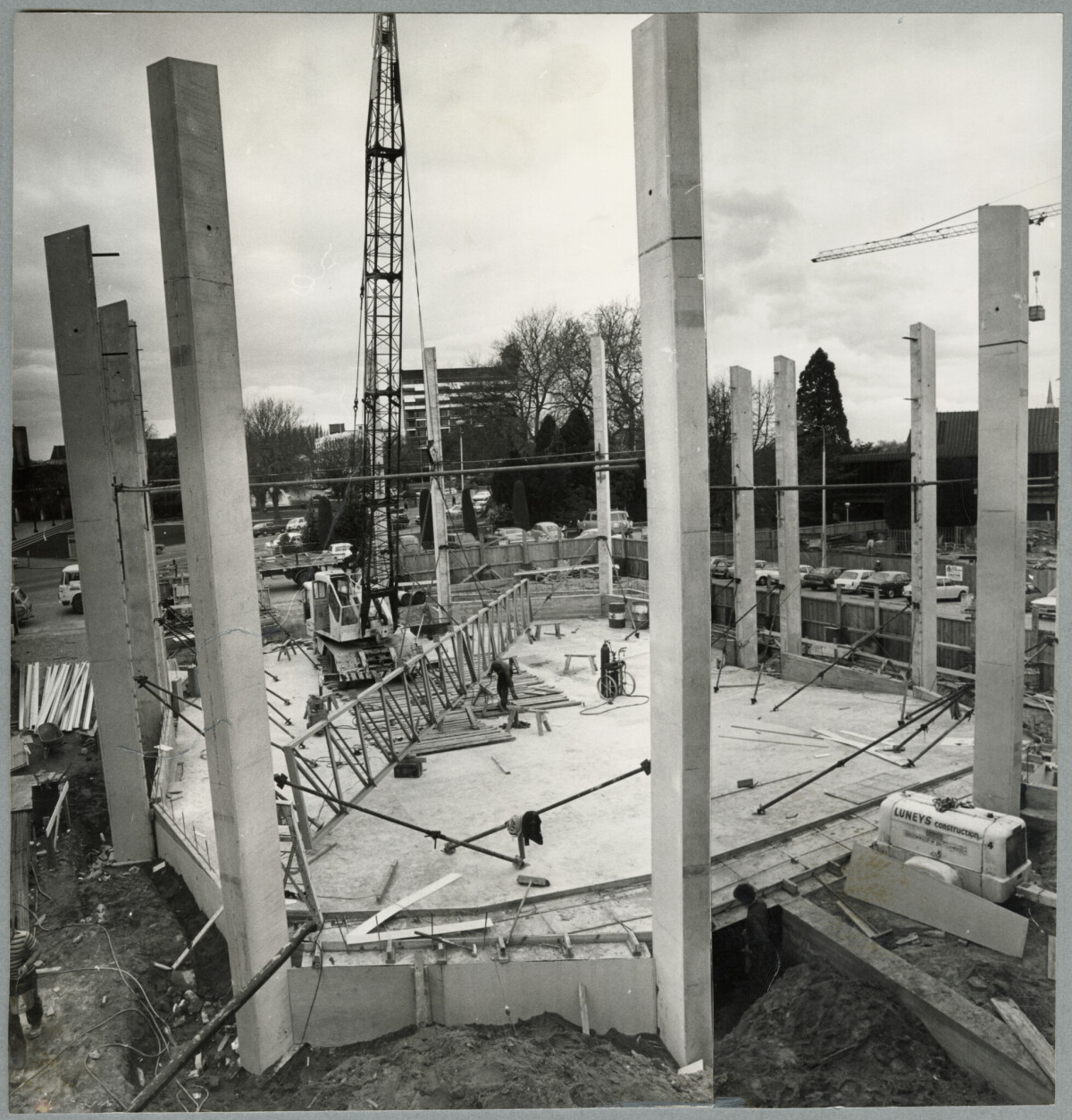 Construction of the new Salvation Army citadel on Victoria Street near Victoria Square showing the fluted panels.
