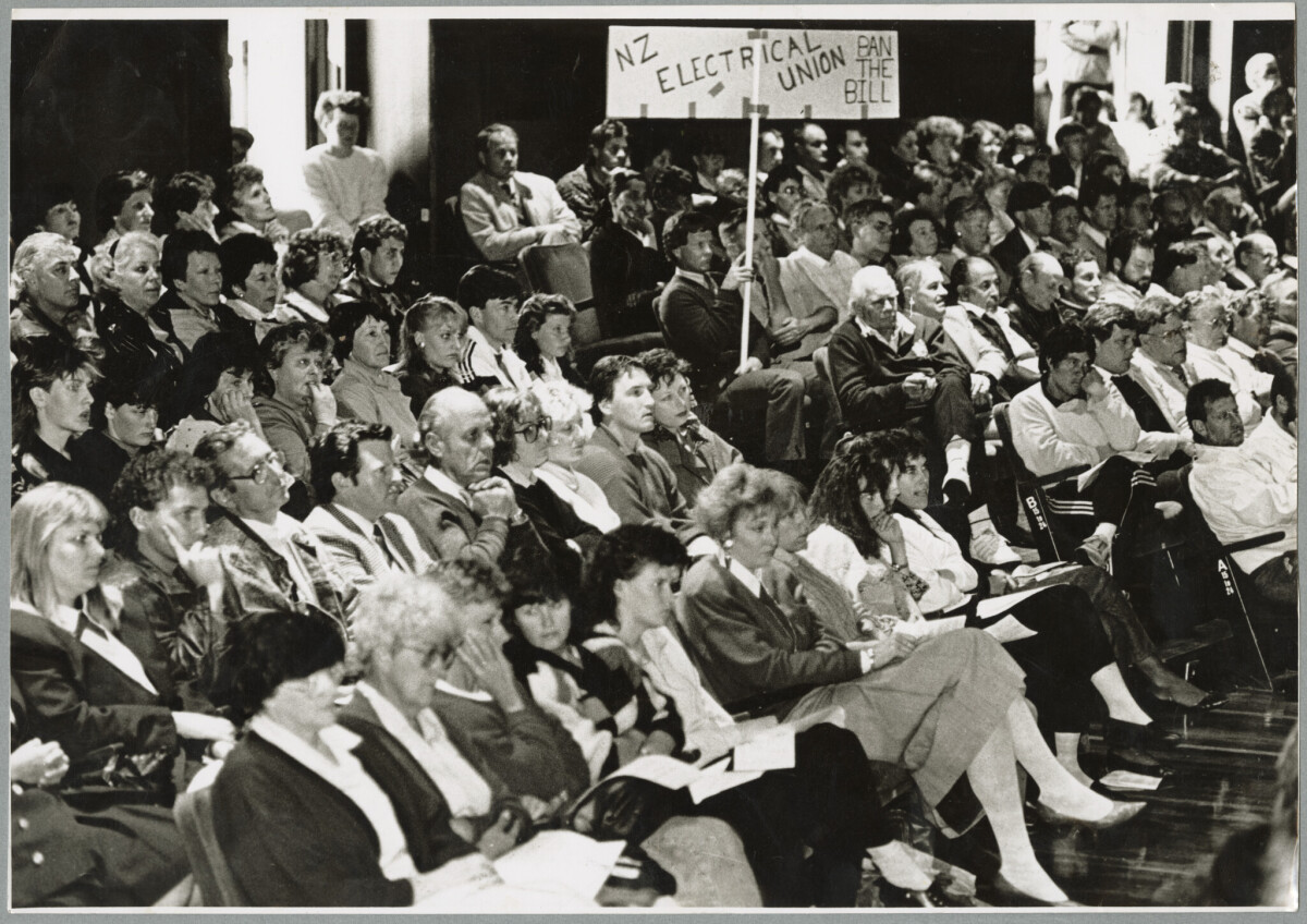 People gathered in Christchurch Town Hall to protest the Employment Contracts Bill.