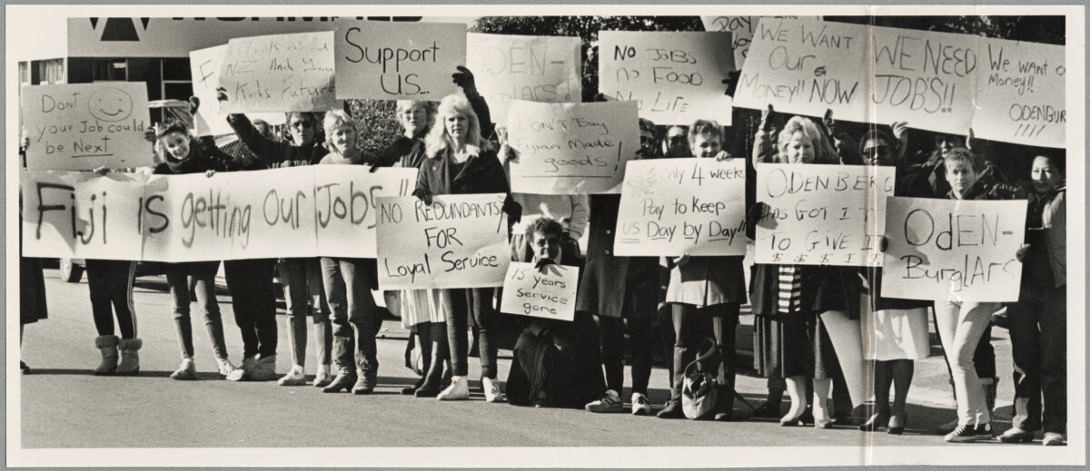 Former staff of the R.W. Saunders Ltd St Asaph Street clothing factory protesting the loss of their jobs.
