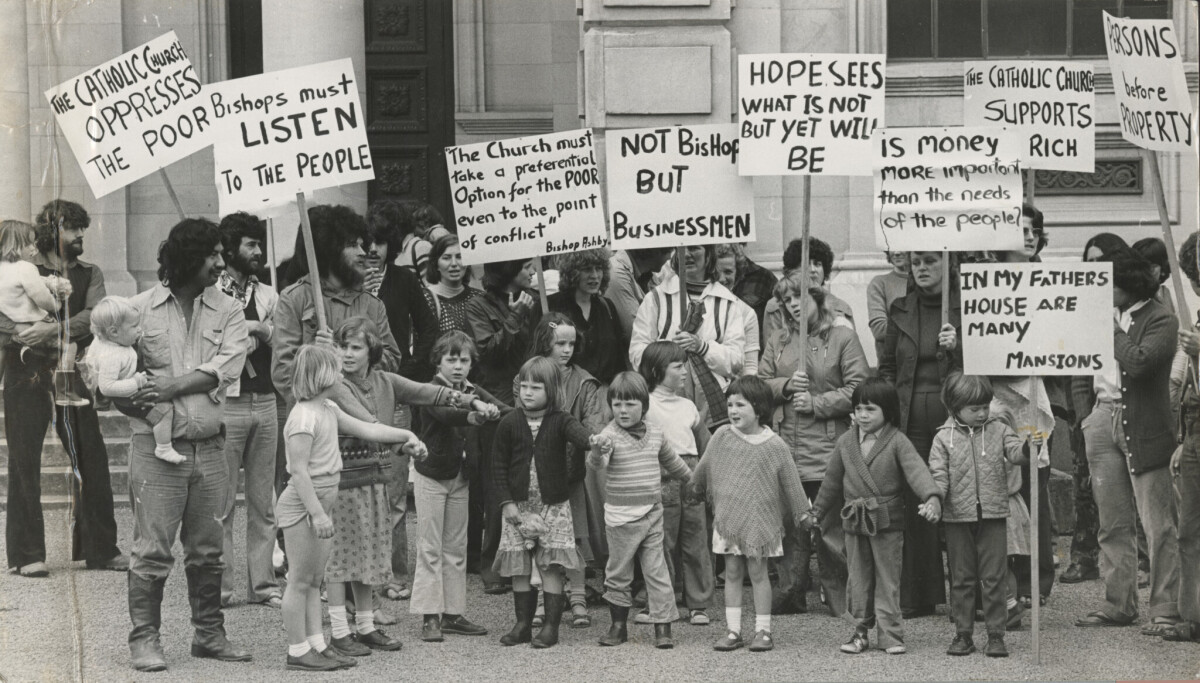 Protest by the Arohanui Community outside the Cathedral of the Blessed Sacrament on Barbadoes Street against the sale of Maryknoll, a worship and refuge centre, by Most Rev. B.P. Ashby Catholic Bishop of Christchurch. Maryknoll is used as a worship and friendship centre, as a refuge for former prisoners, as a drama and recreation centre and as a base for alcoholic support groups.
