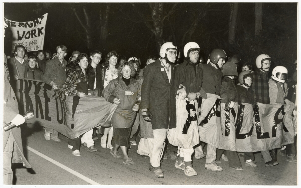 A group of protesters on Deans Avenue heading towards Chateau Regency in Kilmarnock Street, where Prime Minister Robert Muldoon was guest speaker at a Canterbury Chamber of Commerce function.