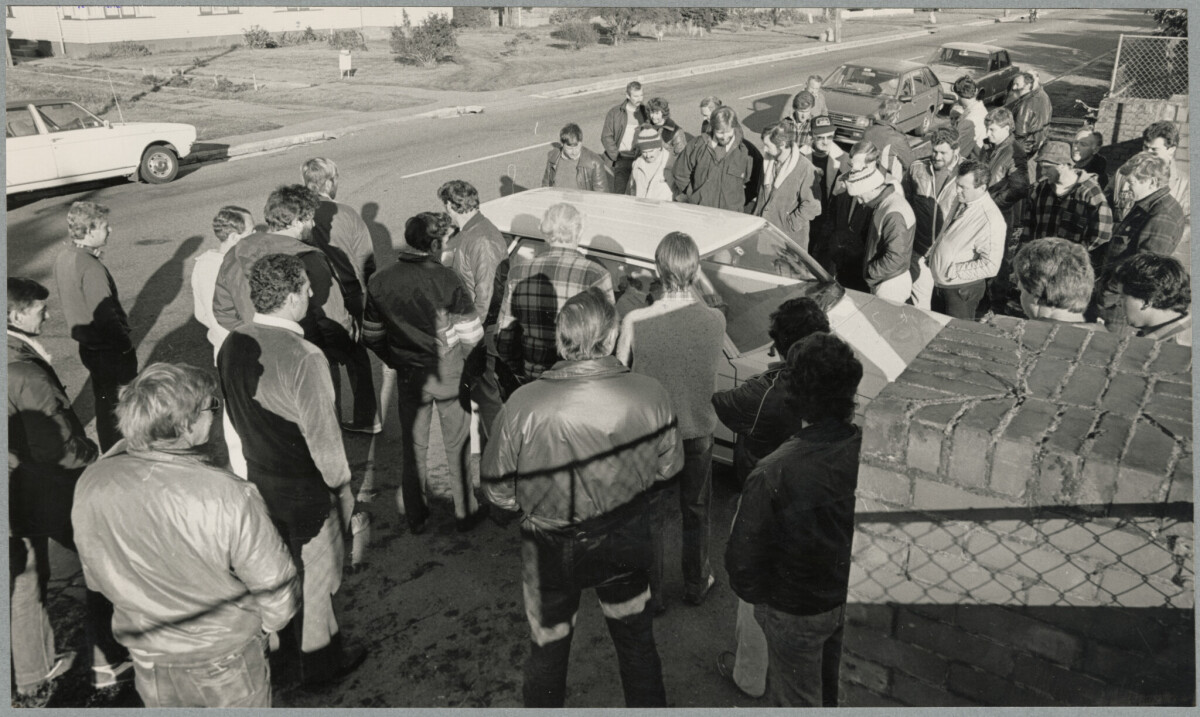 Staff from the Firestone factory in Papanui allowing a car to pass through their picket line picketing outside the gates during a pay dispute.