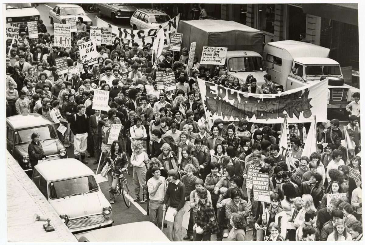 A protest march by University of Canterbury students outside the National Party rooms on Lichfield Street protesting education budget cuts.