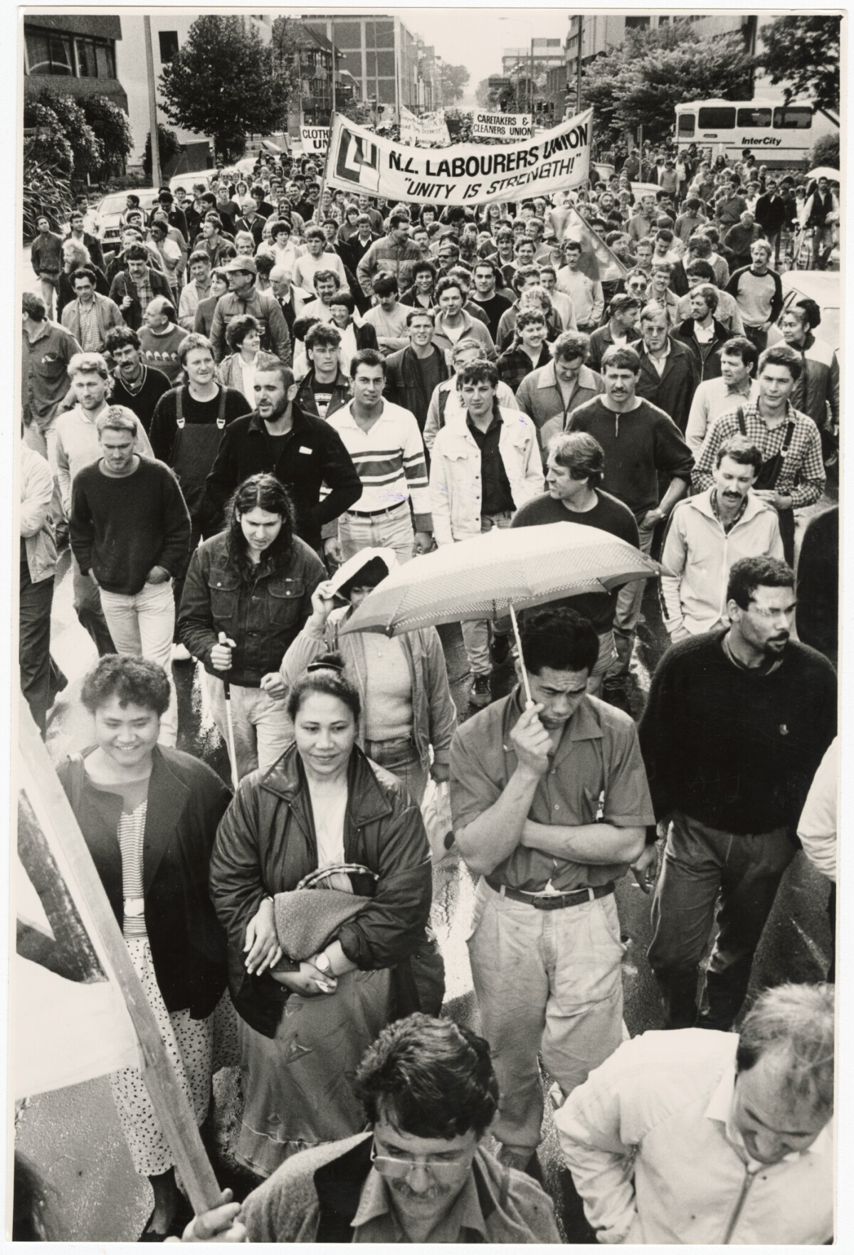 A protest march of various workers unions including the NZ Labourers Union and the Caretakers and Cleaners Union along Kilmore Street from Christchurch Town Hall.