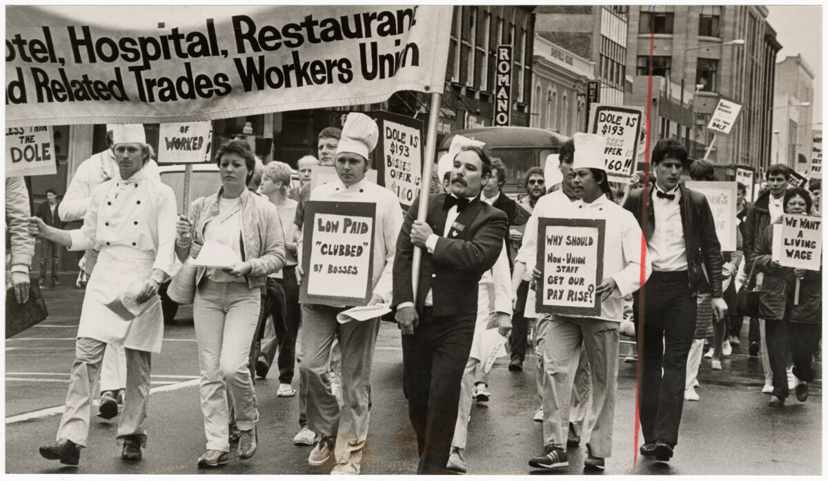 Hotel workers marching in protest to the Hotel Association office in Oxford Terrace.