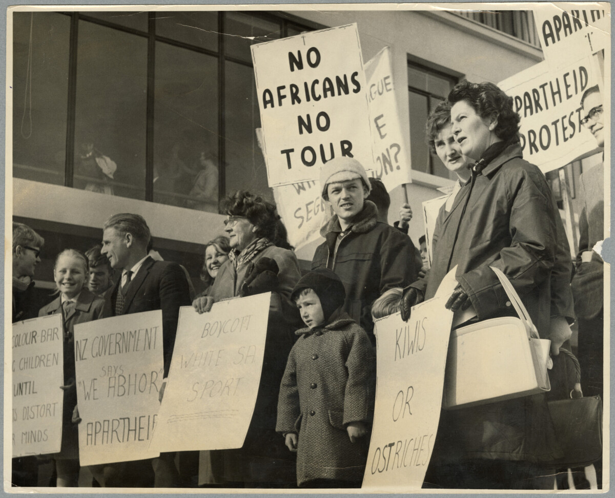 Anti-Apartheid demonstrators protesting the arrival of the South African Rugby League team at Christchurch Airport.