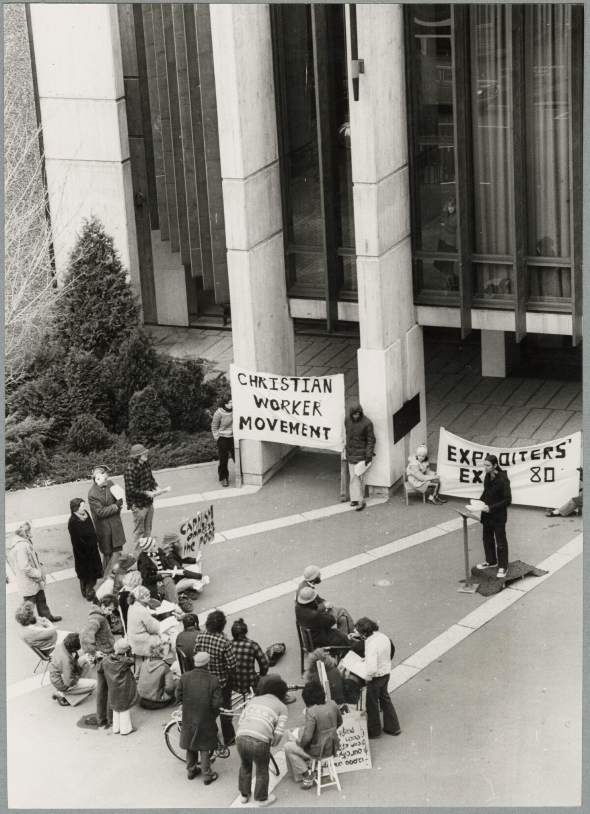 Members of the Christian Worker Movement protesting against property speculators outside the entrance to the Christchurch Town Hall.