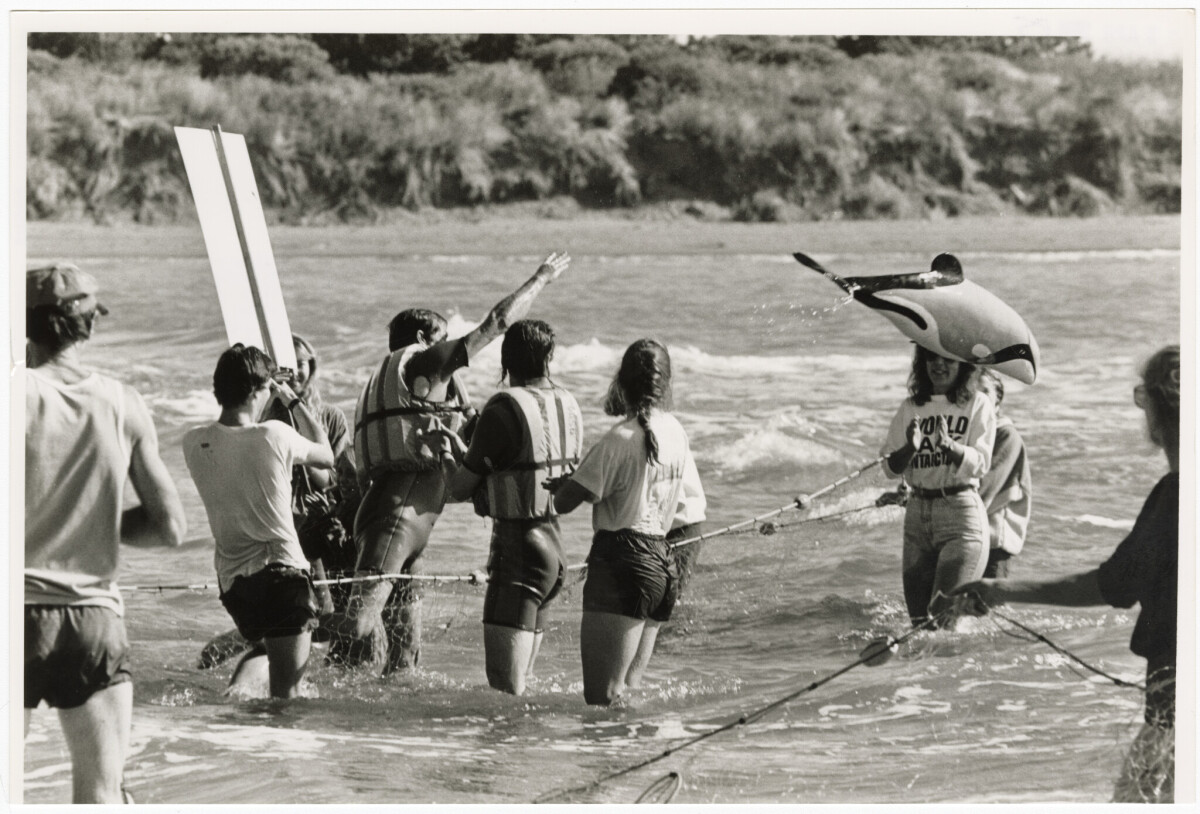 Save Our Seas Coalition members simulating the rescue of a dolphin using a fibreglass replica at Shag Rock to protest the use of set nets.