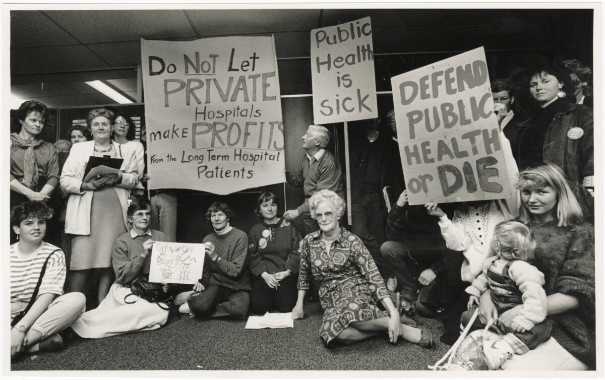 Protesters at a meeting of the Canterbury Area Health Board against the closure of Coronation and Jubilee hospitals.