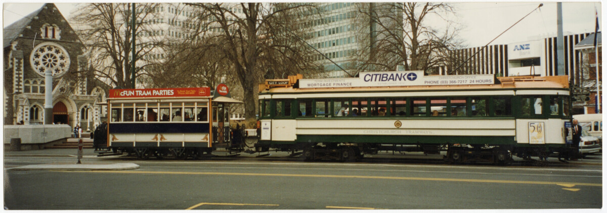 View of Christchurch Tramway Trams in Cathedral Square including a carriage used for McFun Tram parties.