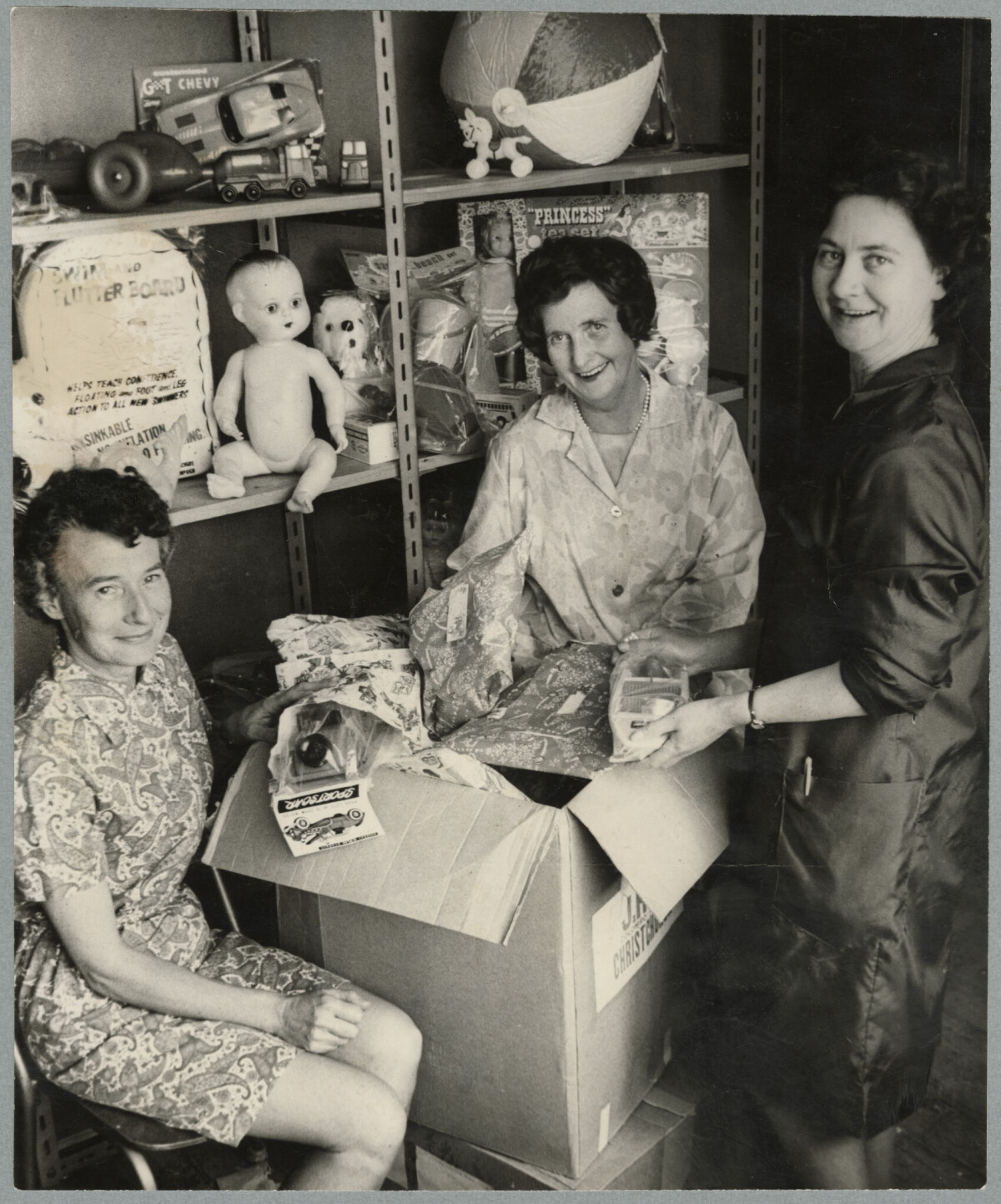 Staff at the central city McKenzies Ltd on Colombo Street packing toys and Christmas gifts. Pictured are, from left, C. M. Daniel, B. Matthews and Y. Birch