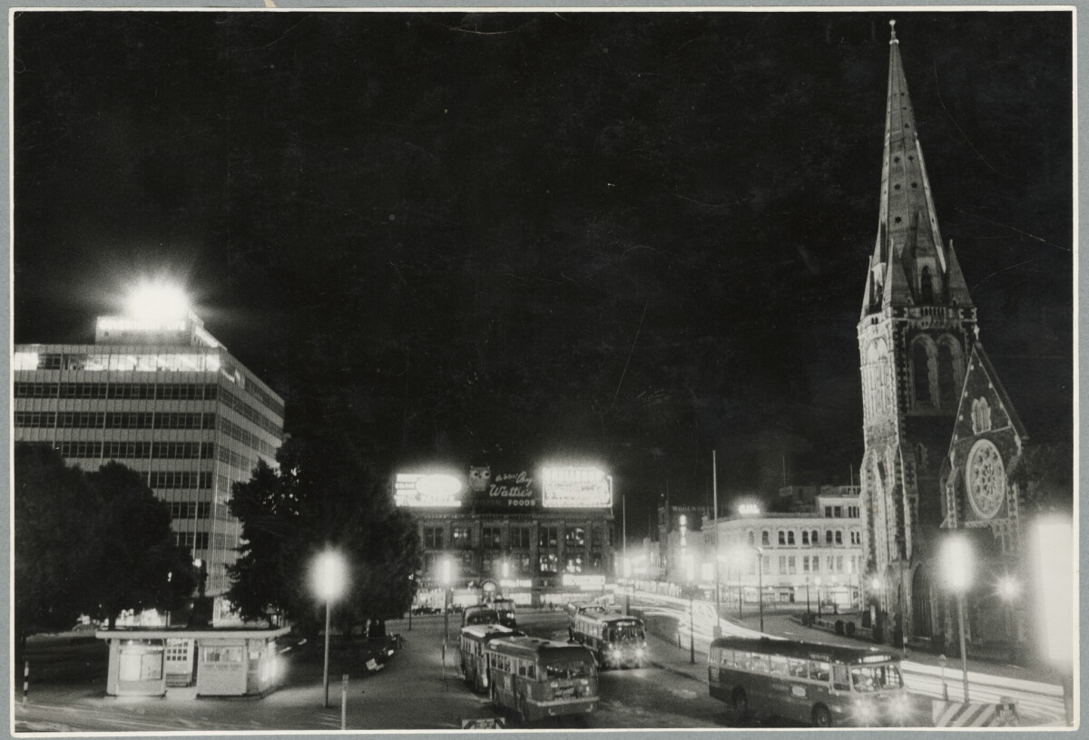 A view of Cathedral Square a night looking towards the north of the Square past ChristChurch Cathedral.