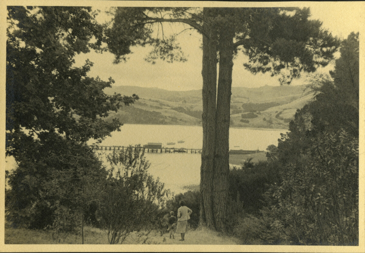 Image from a photograph album of an unidentified woman and boy standing in Akaroa Domain overlooking Main Wharf and Akaroa Harbour.
