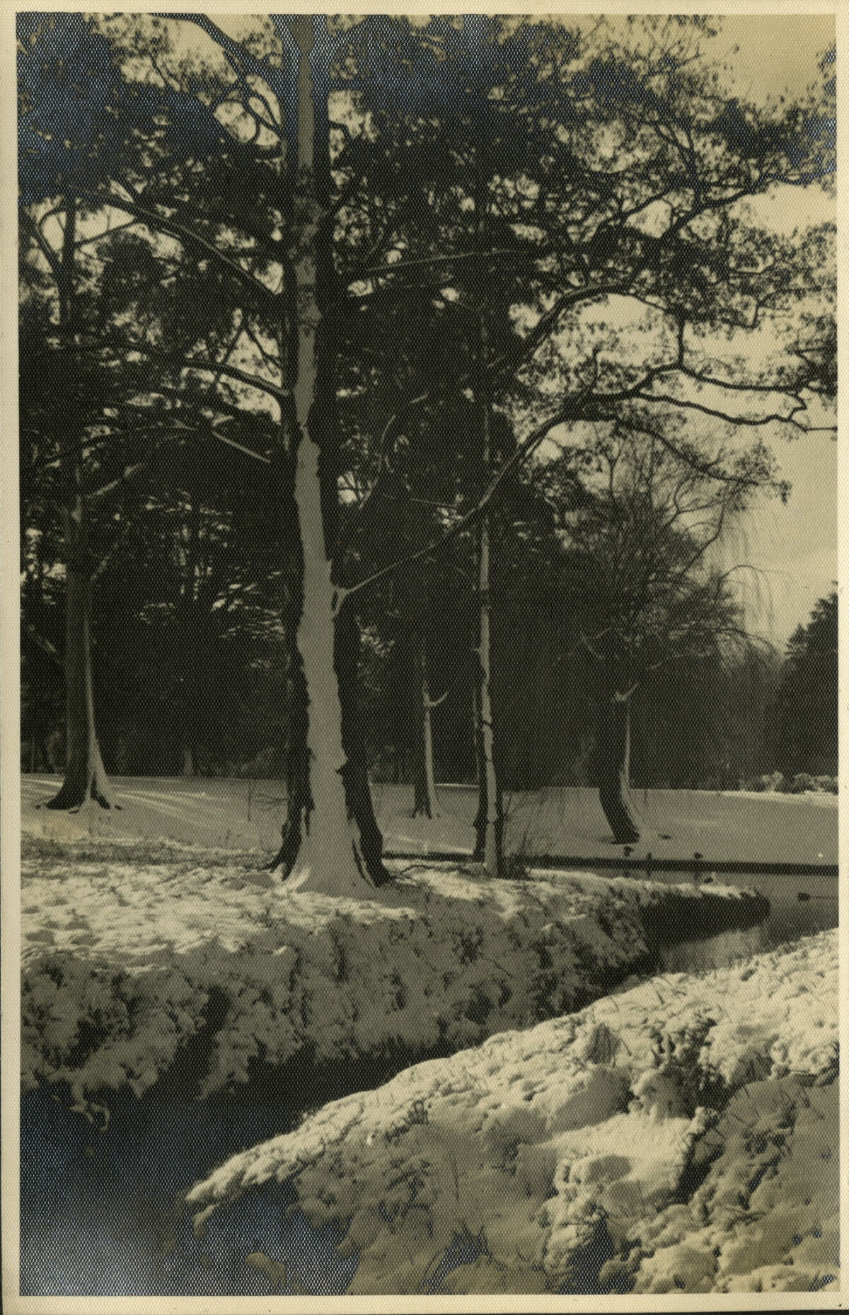 Image from a photograph album of snow and trees in an unidentified park, beside a river.
