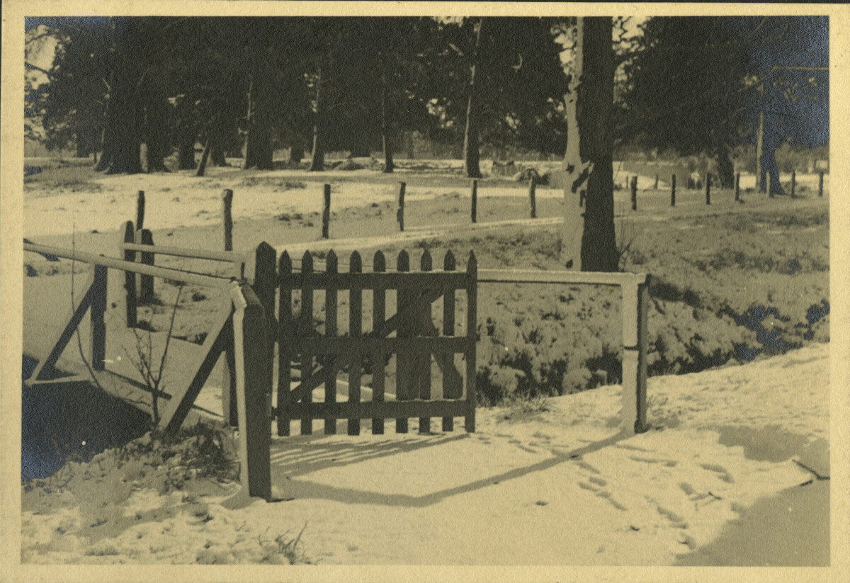 Image from a photograph album of snow on a bridge over a river in an unidentified park.
