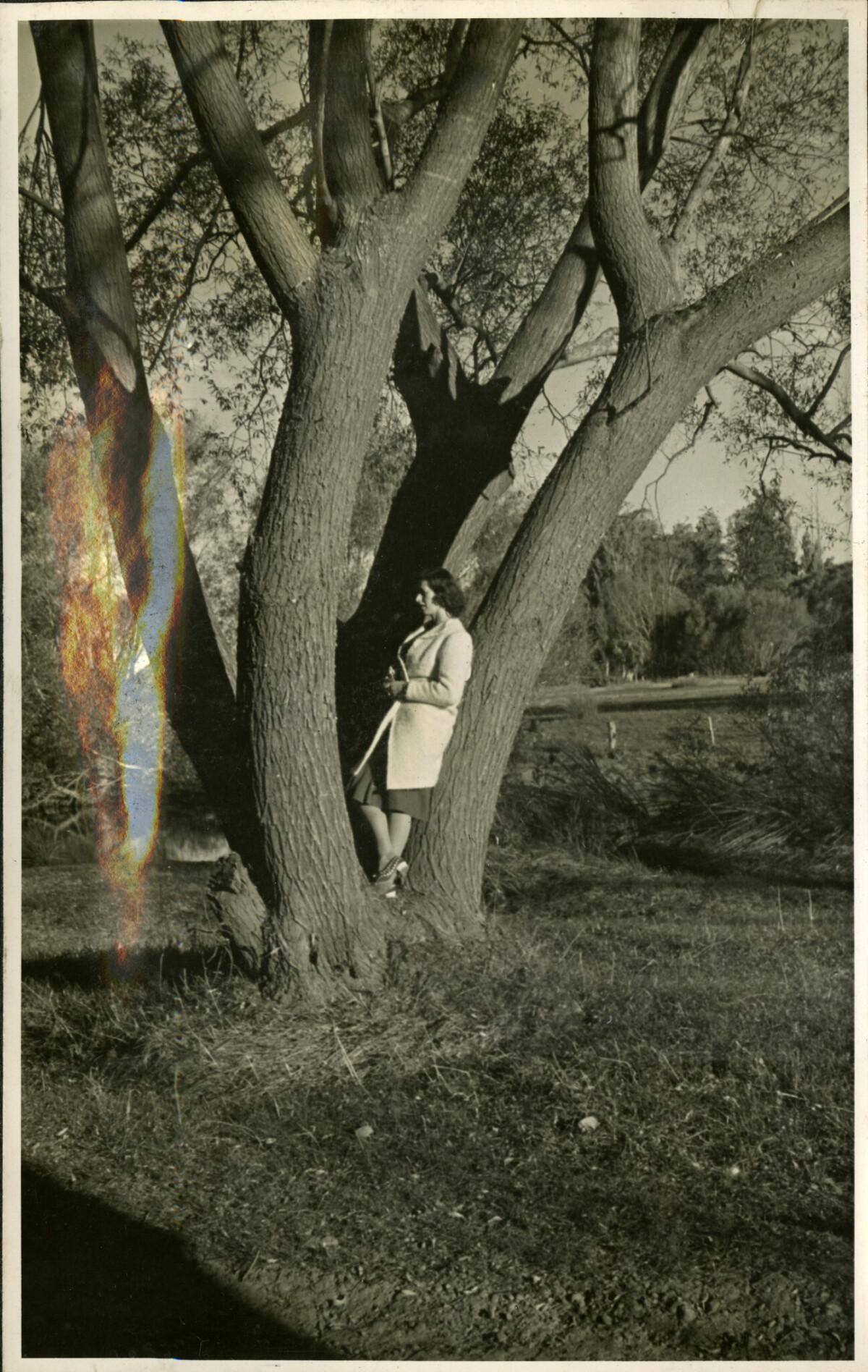 Image from a photograph album of an unidentified woman leaning on a tree.