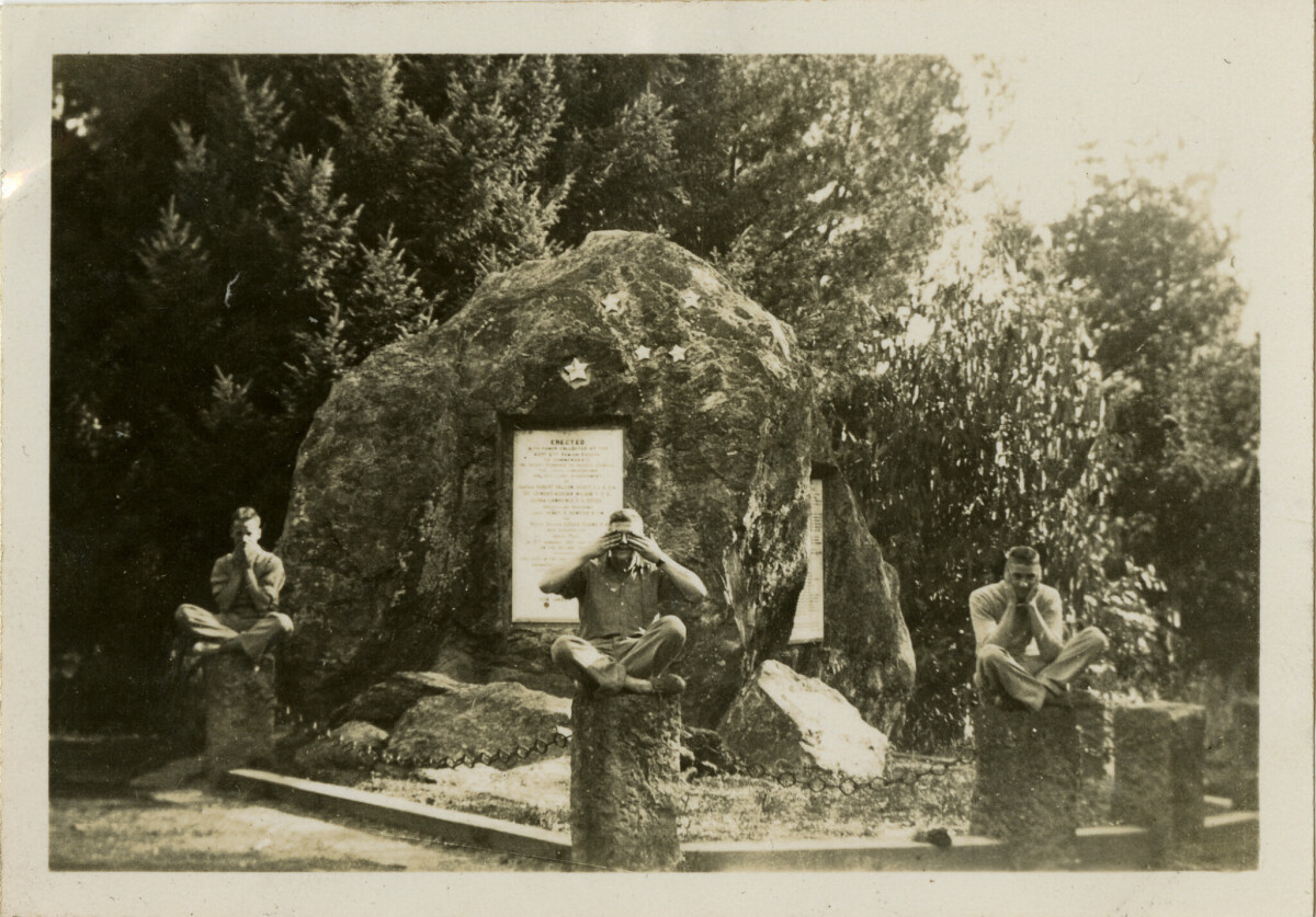 My grandfather travelled all around New Zealand with his mates, and here the 3 of them are sitting in front on a monument? Speak - see - hear no evil, my grandfather Stewart Avent is doing the hear no evil