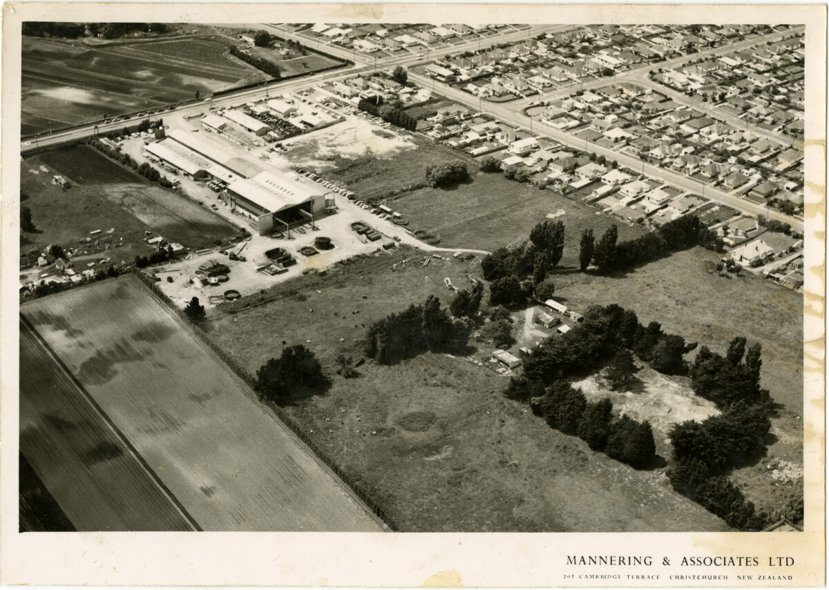 Aerial view of F. W. Matthews Ltd. Engineering Works on Marshland Road in Shirley. Photo shows intersection of Marshland Road, Lake Terrace Road, and Briggs Road.