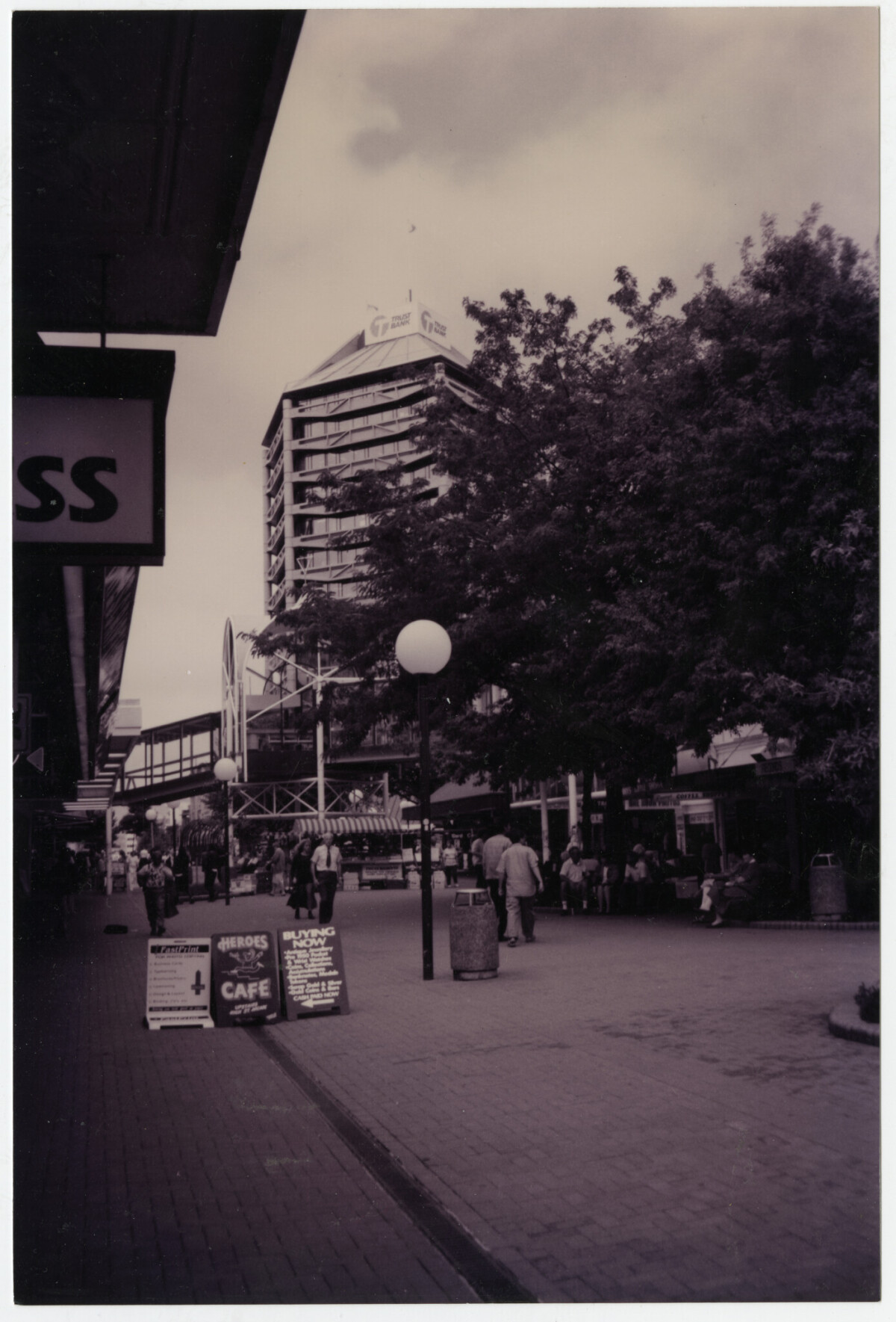People and buildings on High Street, looking southeast towards the intersection with Cashel Street.
