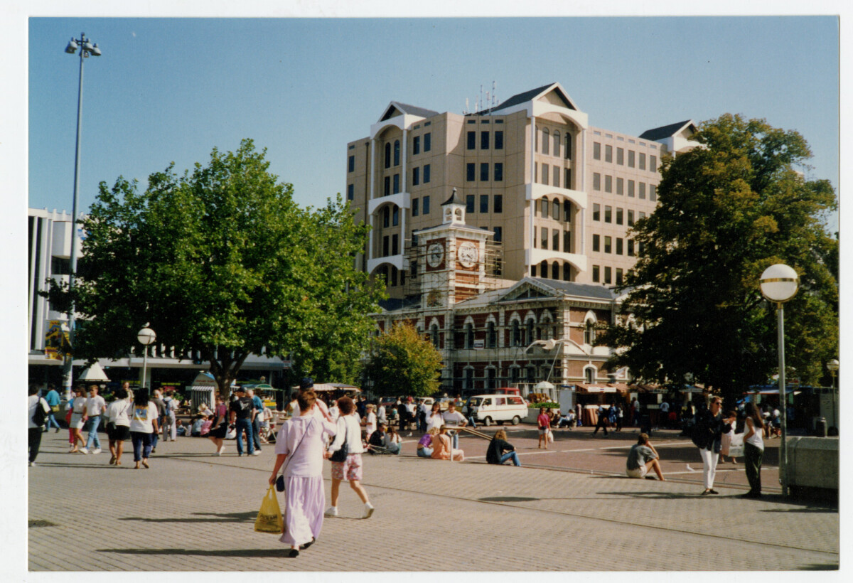 People walking in Cathedral Square looking towards Woodwards ...
