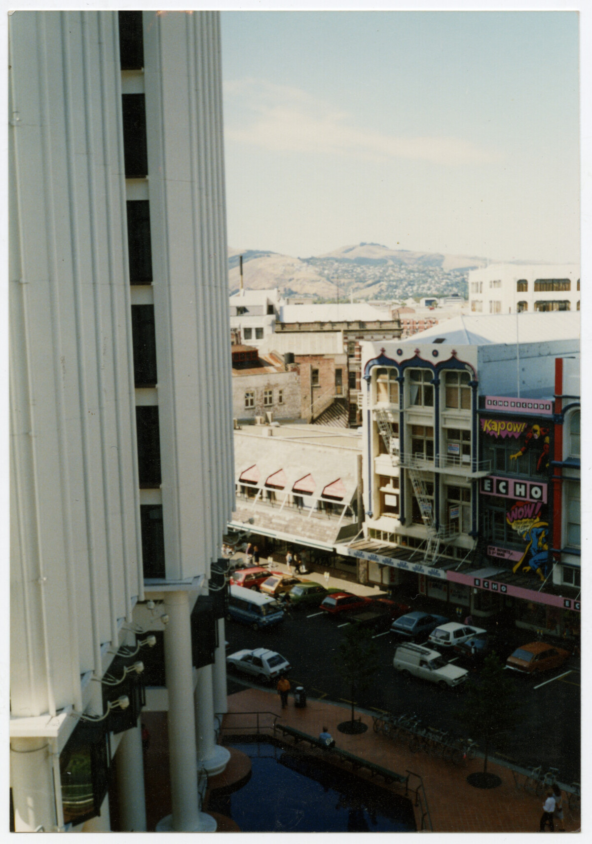 Buildings on High Street, looking southeast from Cashel Street car park. The United Bank building on the left, and Echo Records on right.