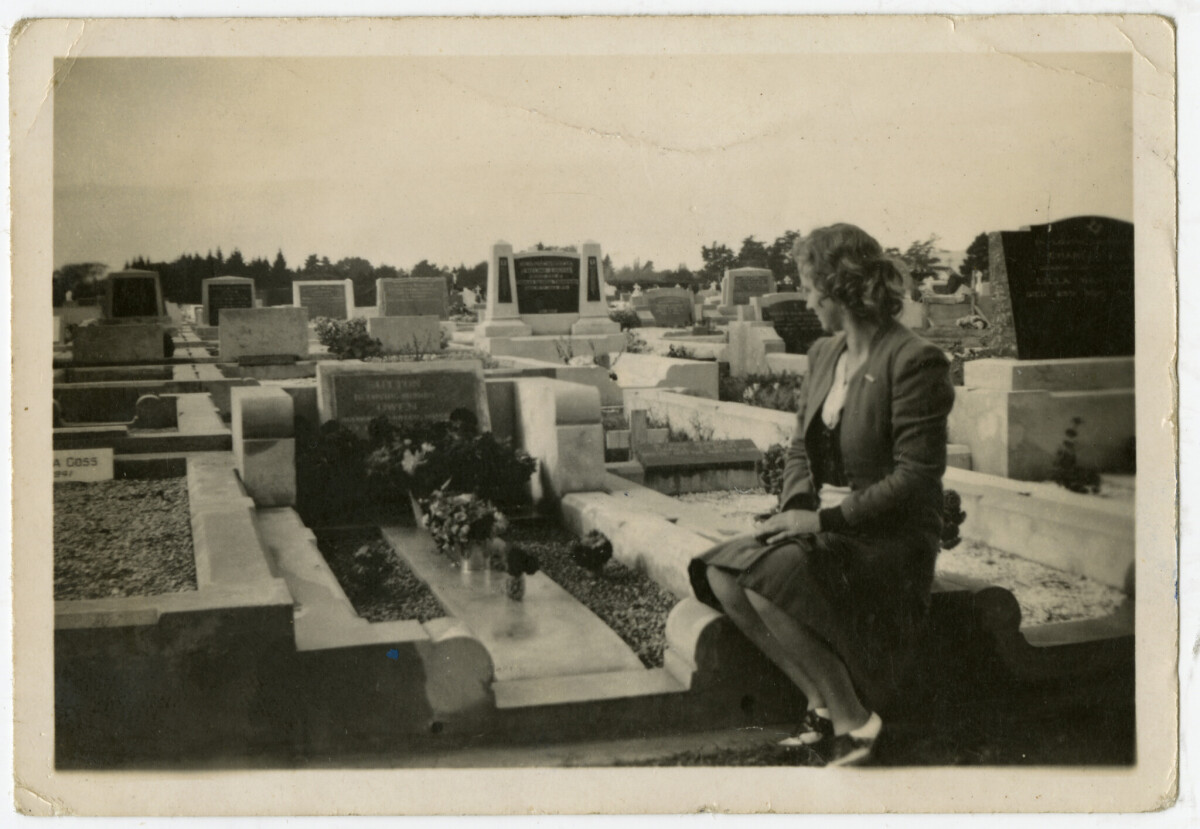 Contributor's note: "My mothers brother Owen Sutton was killed in a traffic accident in Christchurch during World War II. He was just about to be sent for training in Canada, as Air Crew. He had been married about a year, and this photo shows his widow, Zelda, sitting on his grave at Bromley cemetery, not long afterwards, probably when the headstone was put in place."