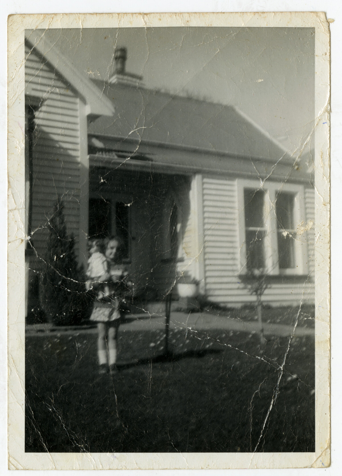 Michelle Lilly on her 5th birthday holding a doll standing outside a Bach in Akaroa.