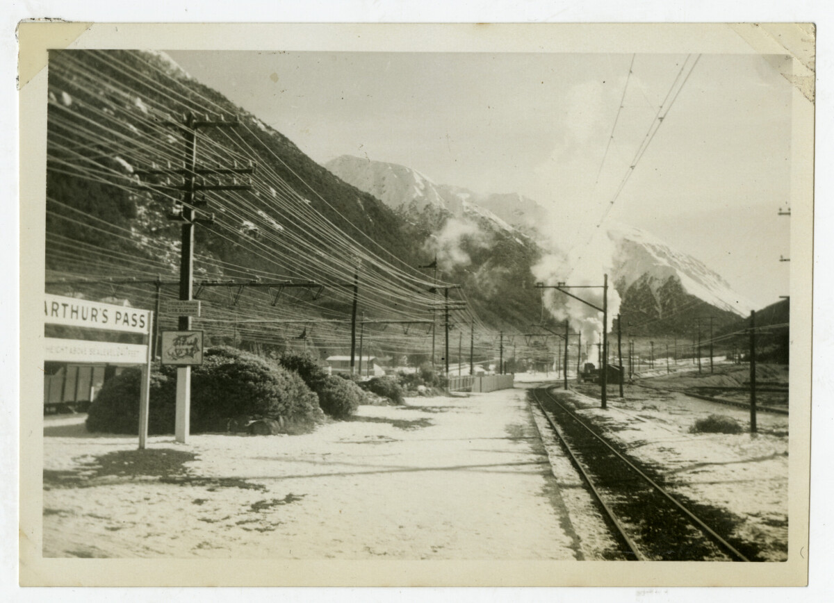 A train on the railway tracks at the Arthur's Pass Railway Station.