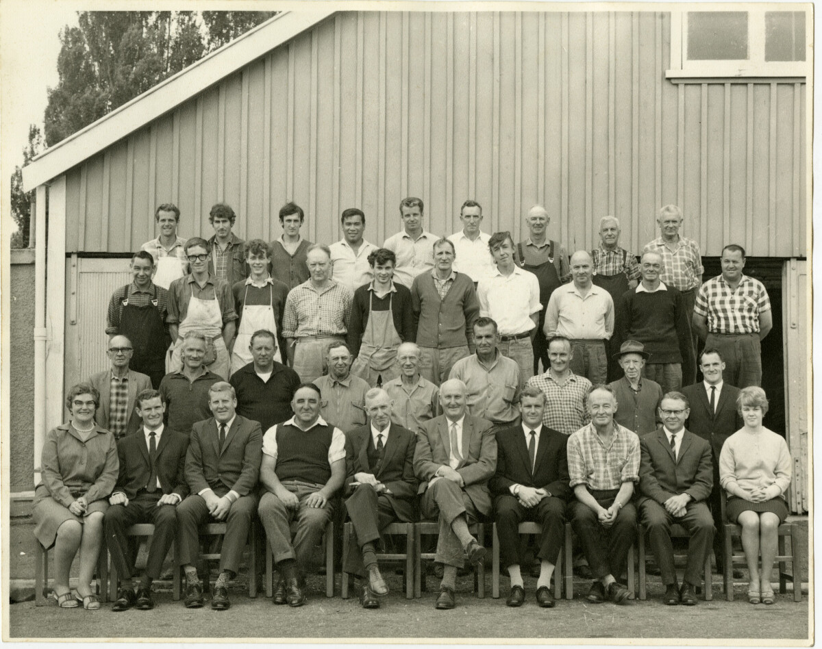 Portrait of staff at the Papanui Timber Co. on the corner of Frank Street and Papanui Road.