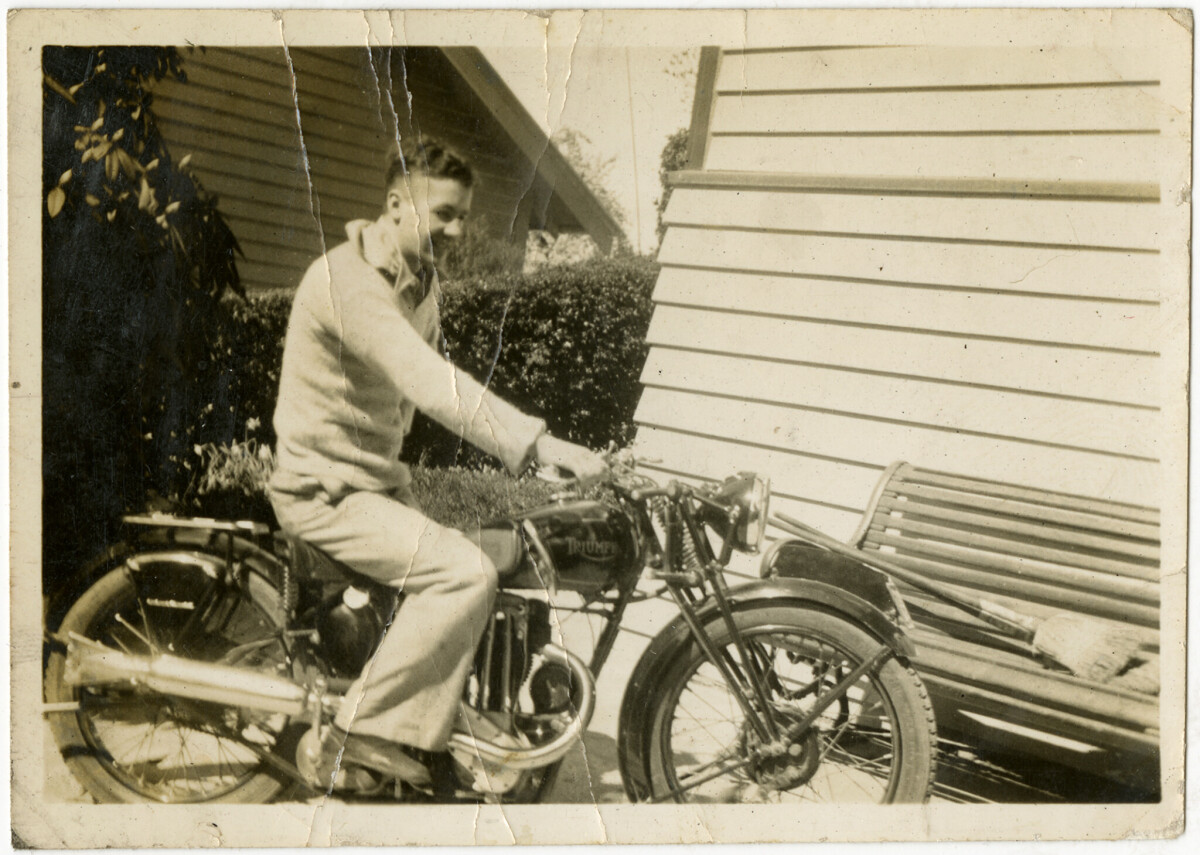 An unidentified man, a friend of the Crofts family, sitting on a motorcycle.