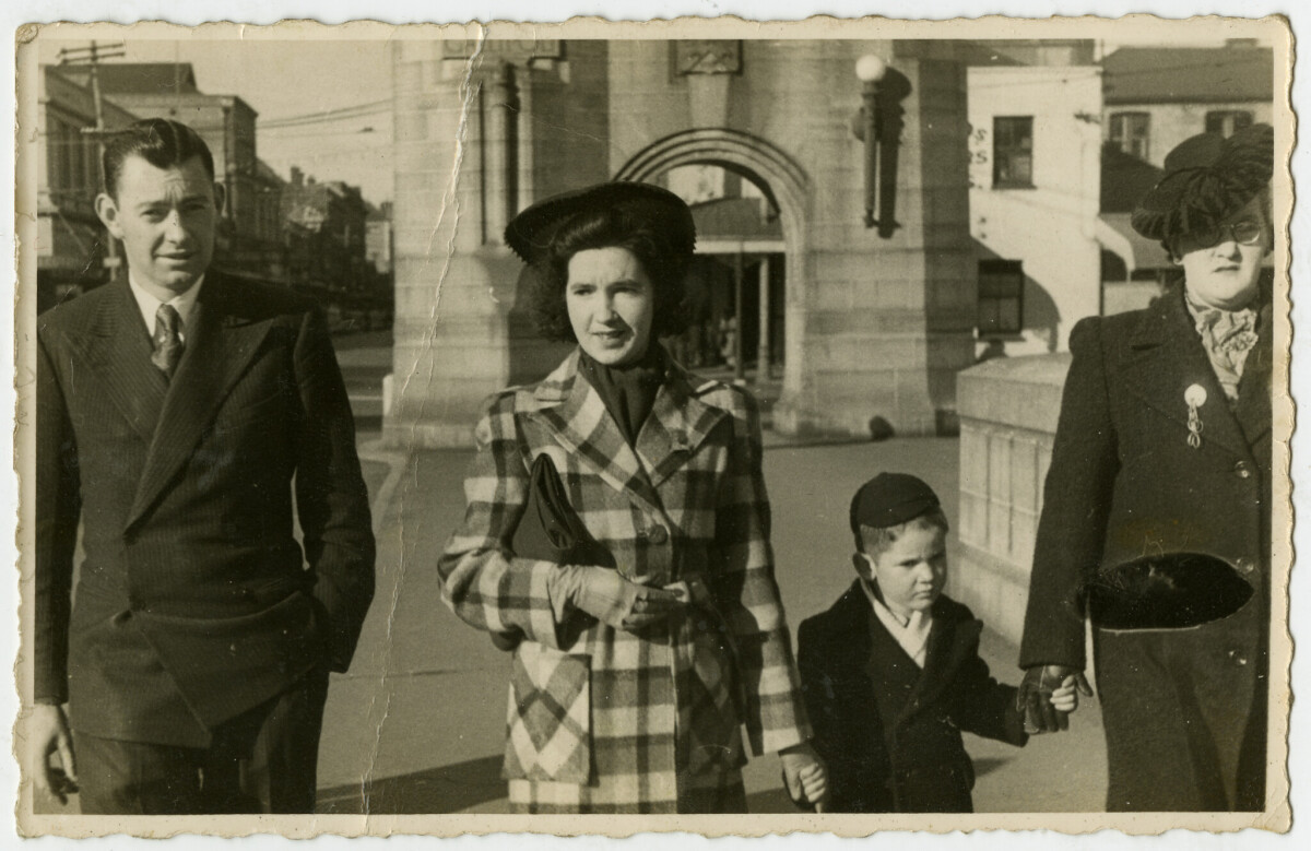 The boy is my father Gavin Francis Wren, born 1940. He is holding the hand of his mother Eileen Hyacinth Wren & his sister Lorna Scott (Wren). The other man in the photos is Lorna's husband Eric Scott. They are on the river side of the Bridge of Remembrance. I don't know what the occasion is, but interesting that Cashel Street behind them is empty of people.