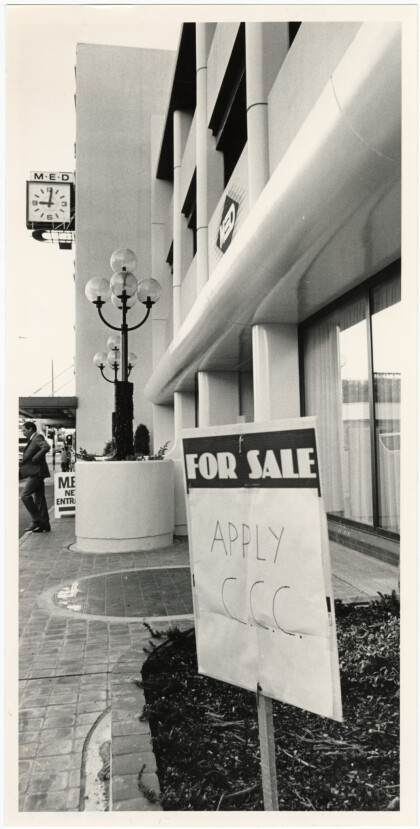 For Sale sign outside the MED building