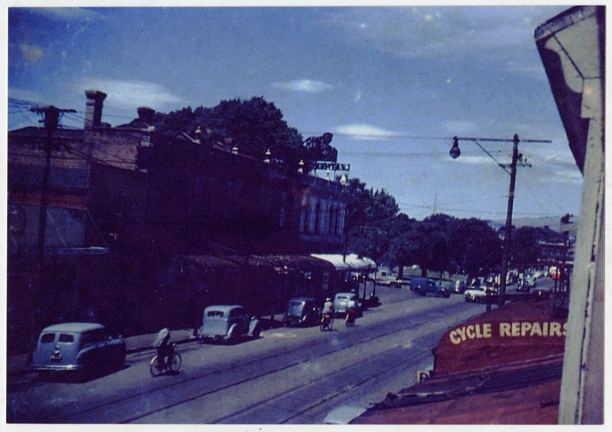 View of Victoria Street looking towards the Victoria Street bridge. Tram lines are visible along the street.